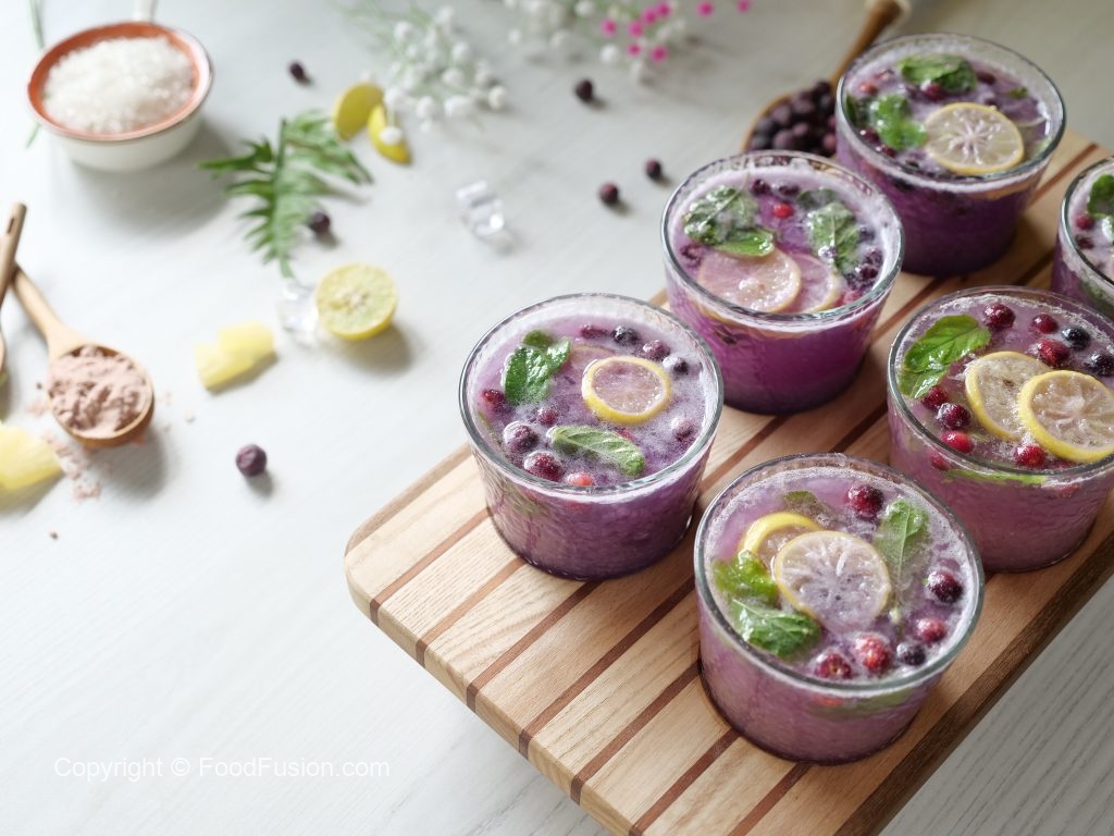 -Serving glass mein lemon slices,pineapple chunks aur podian dal ker muddle ker lein.