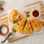 -On silicon baking sheet,place rolled dough,add & spread pizza sauce on half side of the dough,add cheddar cheese,chicken filling,black olives,mozzarella cheese & fold the other side over it,press & twist to seal the edges.