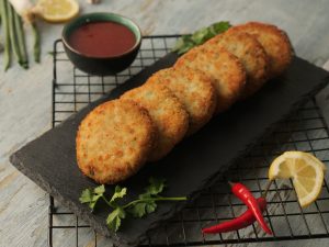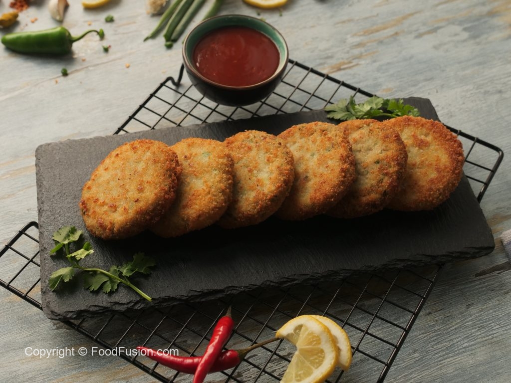 Grease hands with oil,take small quantity of mixture (approx. 50-55g) & make kababs of equal sizes then dip into whisked eggs & coat with breadcrumbs (makes 12-15).