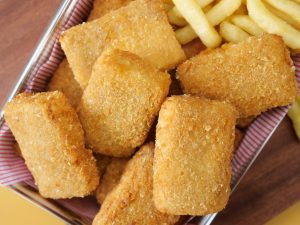 Coat frozen fish nuggets with all-purpose flour than dip into liquid flour mixture & coat with breadcrumbs (makes 26-28).