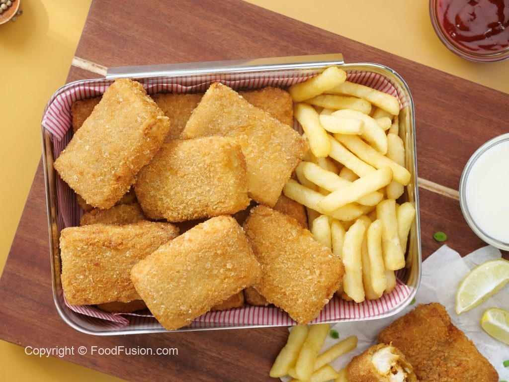 Frozen fish nuggets ko maida mein coat karein phir liquid flour mixture mein dip karein aur breadcrumbs sa coat ker lein (makes 26-28).