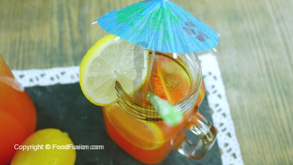 Serving glass mein peach aur lemon slices,peach mixture,thanda pani aur lemon juice dal dein.