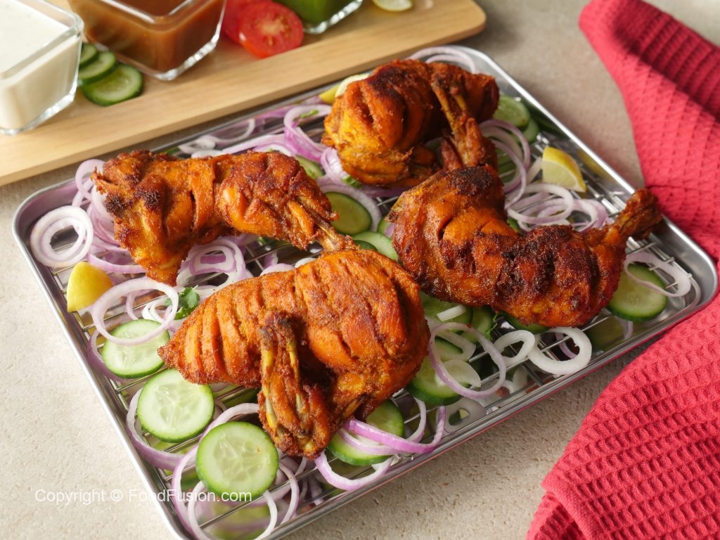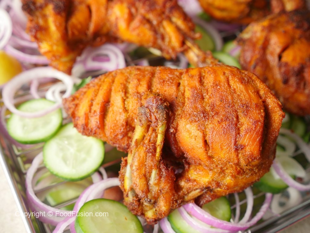 In a wok,add cooking oil,marinated chicken pieces,cover & steam cook on low flame (8-10 minutes each side) then cook on medium flame until water dries up (6-8 minutes).