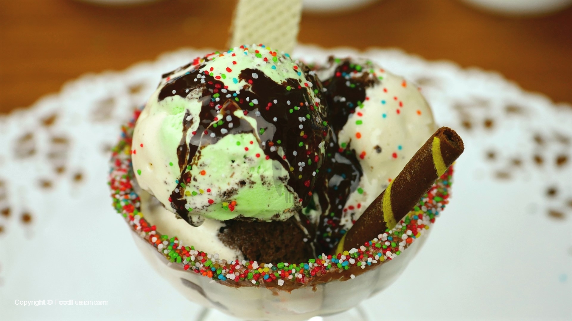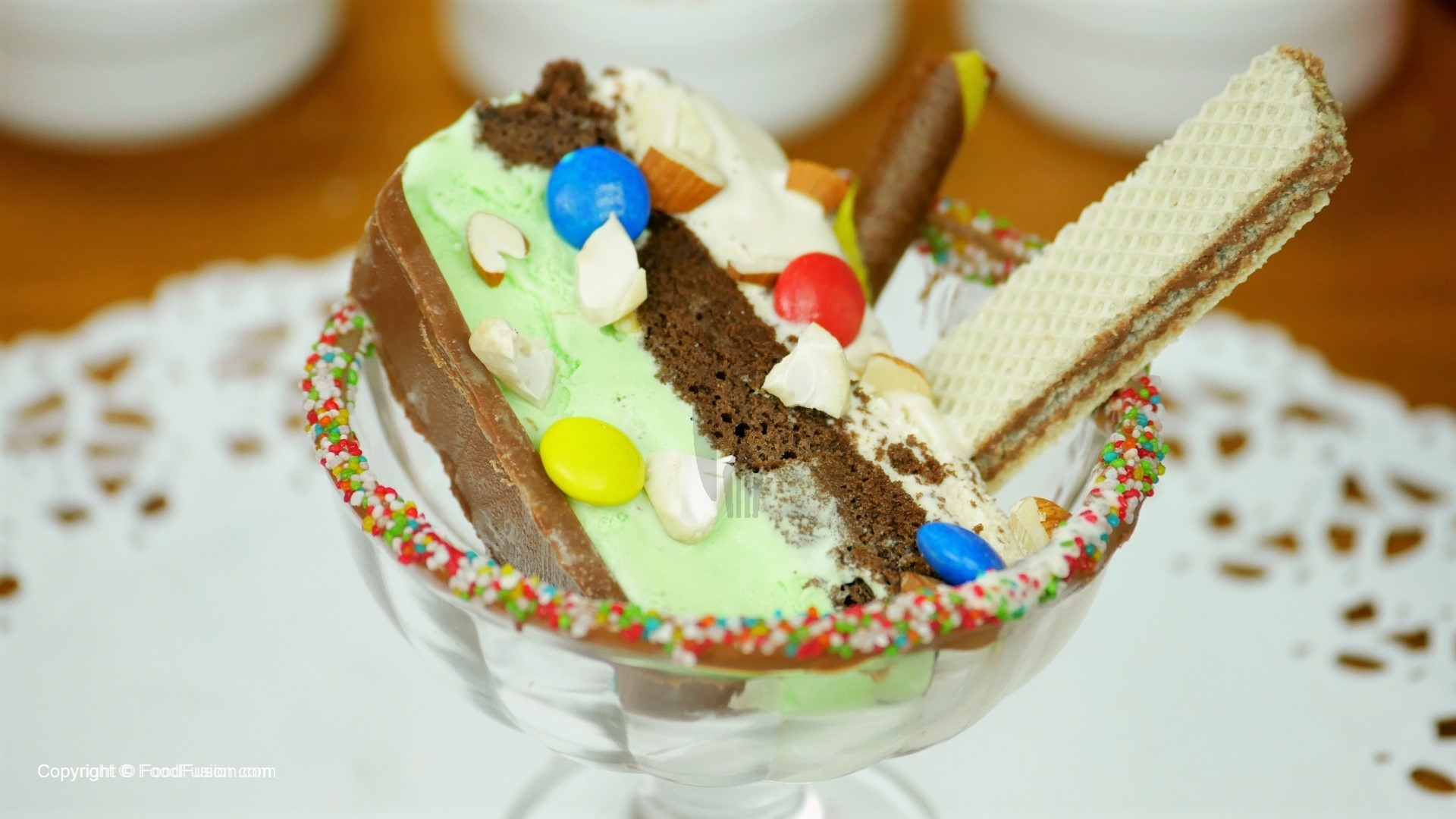 For glass decoration,take ice cream bowl, dip into melted chocolate and coat with rainbow sprinkles.