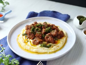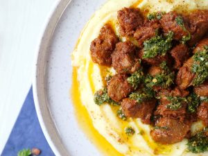 -In a serving dish,add mashed potato,chimichurri sauce,fry beef boti,chimichurri sauce,chaat masala & serve!