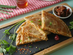 Roll out another dough with the help of rolling pin,add & spread prepared chicken filling,green onion leaves,mozzarella cheese,place another rolled dough,press & seal the edges (makes 6).