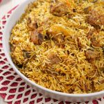 -Add mint leaves,fresh coriander,green chillies,boiled rice,mint leaves,fresh coriander,green chillies, fried onion,orange food color & desi ghee,cover with kitchen cloth & lid and steam cook on low flame for 10-12 minutes.
