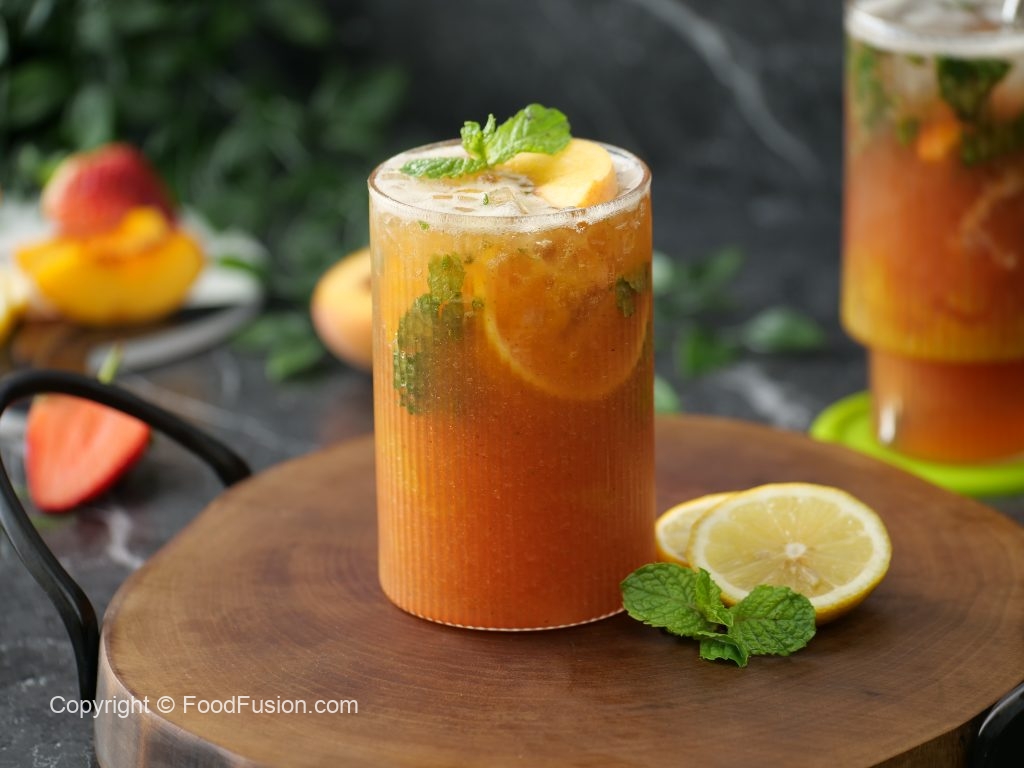 -Garnish with peach slice,mint leaves & serve!