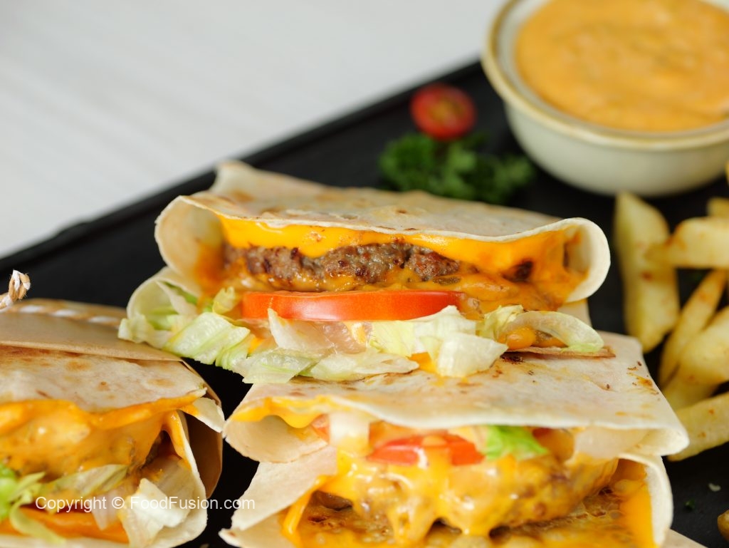 -On a tortilla wrap,place two cheddar cheese slices,beef patty on one cheese slice,iceberg,tomato, prepared burger sauce on beef patty & fold sides to make a wrap.