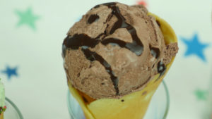 Now dip prepared cone into melted chocolate,multi sprinkles,add ice cream scoop and garnish with multi sprinkles,bunties and chocolate sauce.