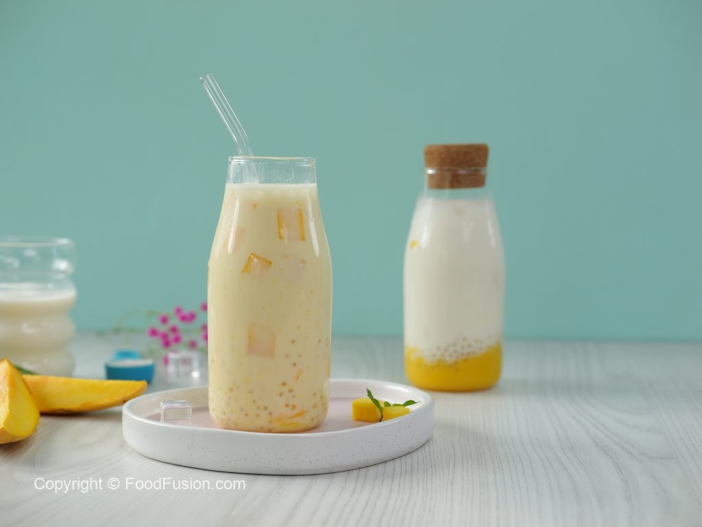 -Glass bottle mein tayyar mango puree (2-3 tbs),boiled sagudana (2 tbs),condensed milk mango chunks,ice cubes aur doodh dal ker stir ker lein & serve karein!