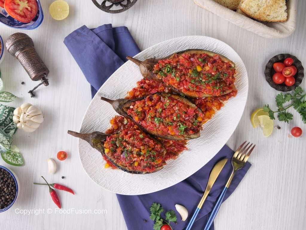 -Make a slit in each eggplant lengthwise with the help of knife & open with spoon.