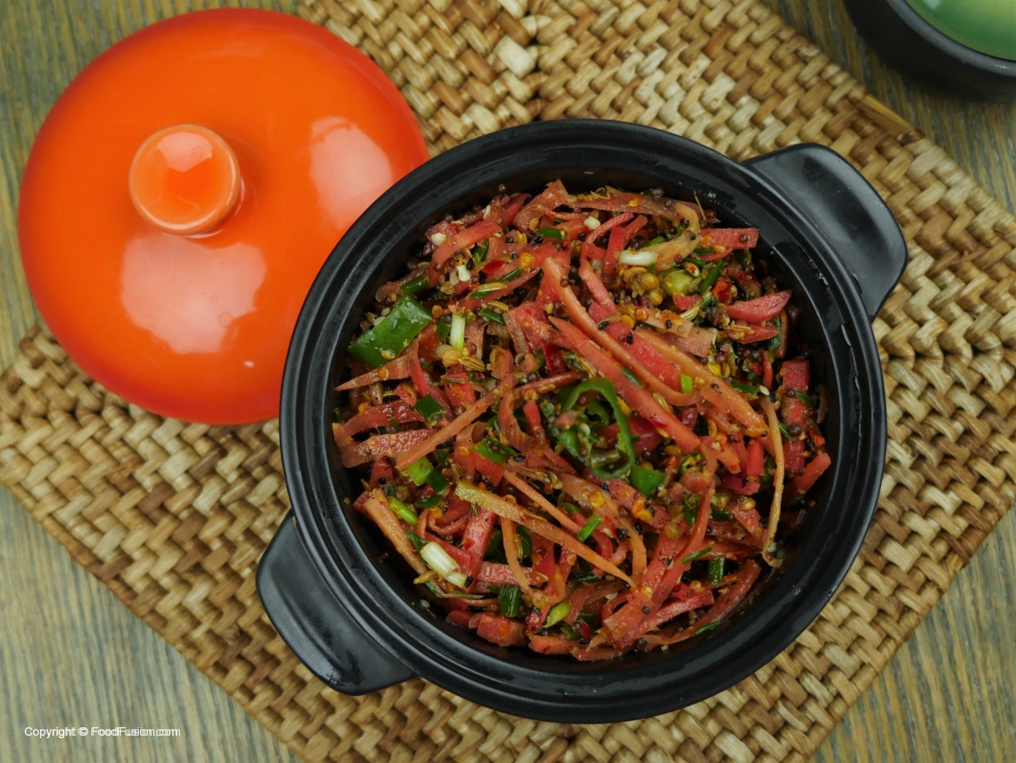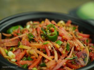 In bowl,add oil,nigella seeds(crushed),mustard seeds (crushed),coriander seeds(crushed),salt,red chili flakes,fennel seeds (crushed),tarti,garlic paste,green garlic,green chili and carrots.