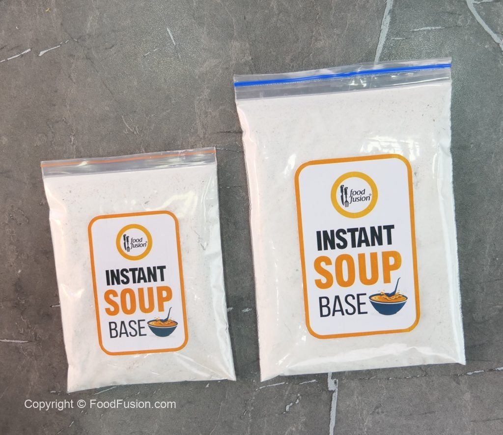 -Bowl mein cornflour,chicken powder,lehsan powder,pink salt,kali mirch powder,safed mirch powder, onion powder aur dried parsley dal ker ache tarhan mix ker lein.Instant soup base tayyar hai (yields: 350g, 35 tbs)
