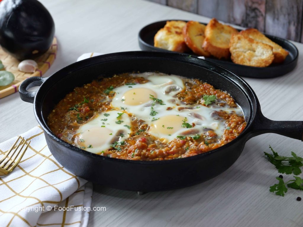 -Insert skewer & fire roast eggplant over medium flame until skin is charred,remove charred skin,chop well & set aside.