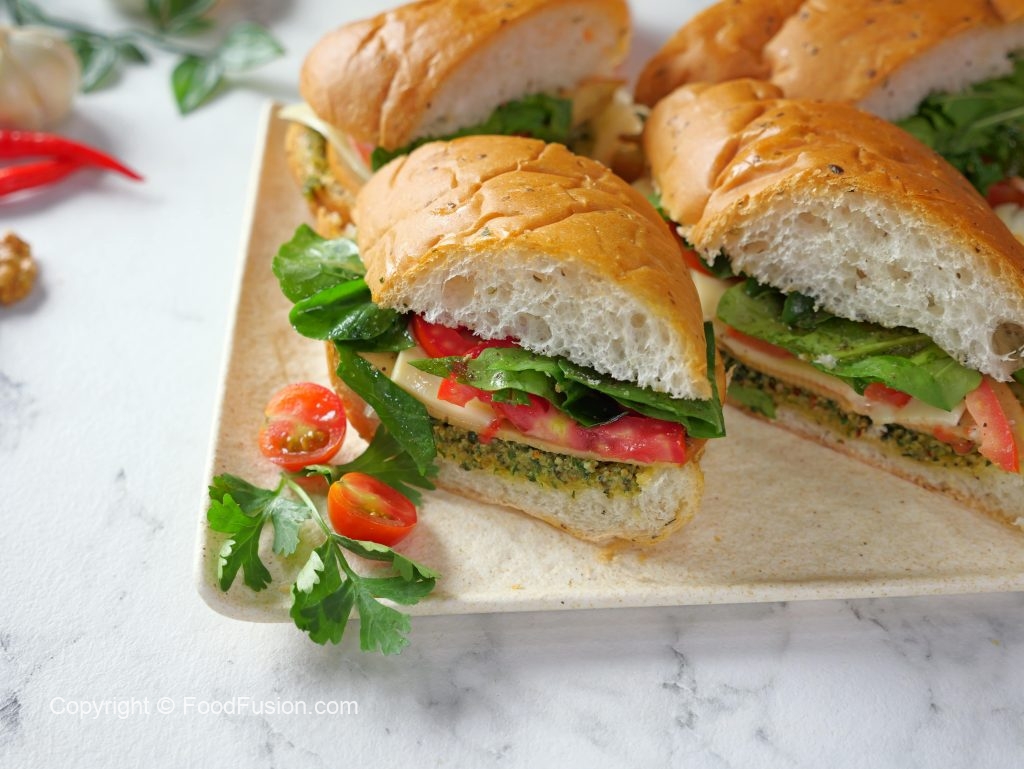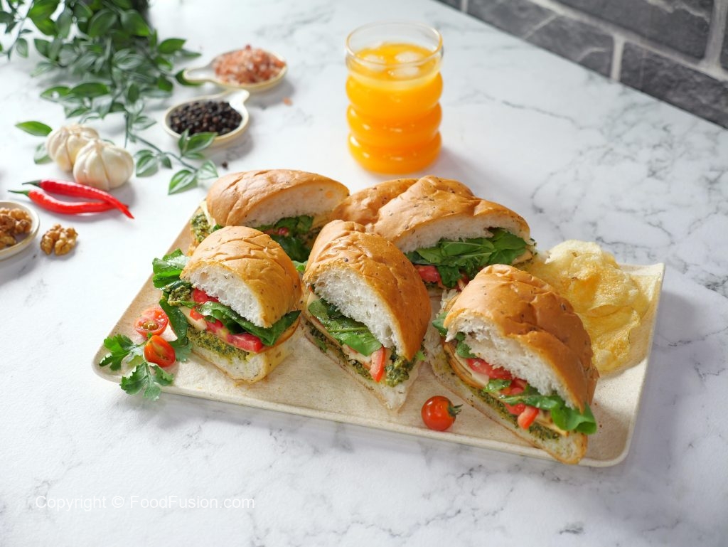 -Add & spread prepared pesto,mortadella slices,cheese slices,tomato slices,rocket leaves,olive oil,pink salt,black pepper powder & cover with top.