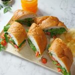 -Tayyar pesto,mortadella slices,cheese slices,tamatar,rocket leaves,olive oil,pink salt aur kali mirch powder dal dein aur top bread se cover karein.