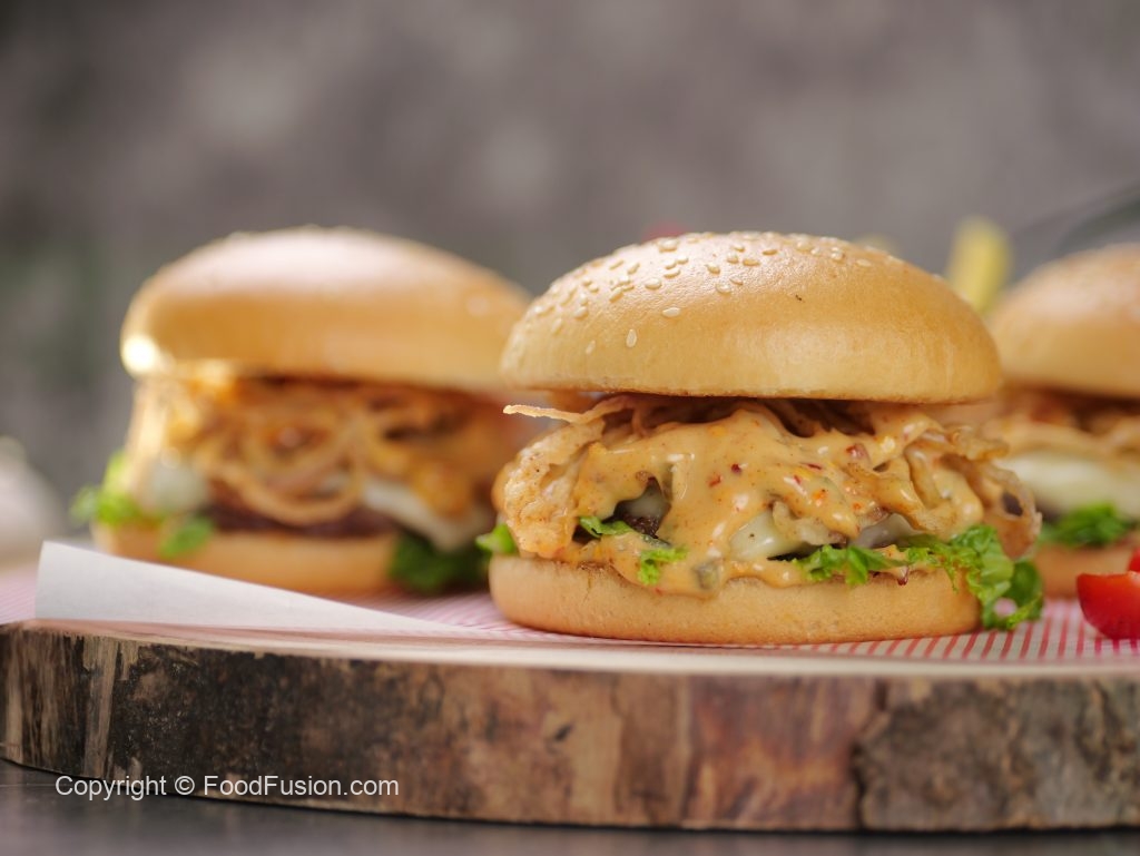 -On burger bun,add & spread jalapeno burger sauce,lettuce leaves,cheese patty,onion rings,jalapeno burger sauce & top with another bun to make a burger (makes 5).