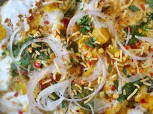 -On serving dish,break kachoris,add prepared tarkari,yogurt,chaat masala,green chutney,imli ki meethi chutney,onion,red chilli crushed,nimco sev,fresh coriander & serve!