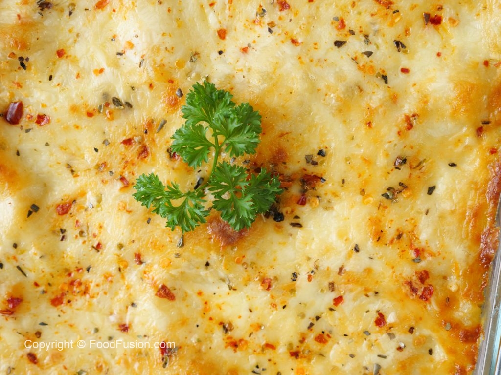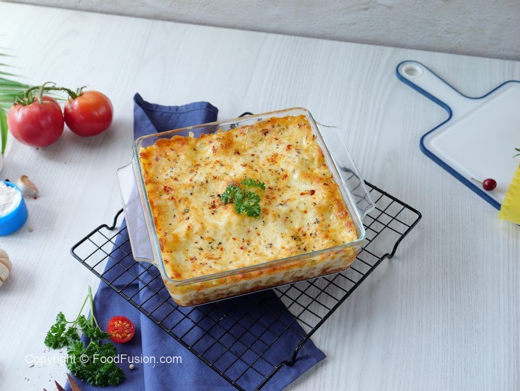 -In a (7.5 X 7.5 inch) oven safe baking dish,add & spread red chicken sauce,lasagna sheets,white sauce,red chicken sauce,cheddar cheese,mozzarella cheese,lasagna sheets,white sauce,red chicken sauce,cheddar cheese, mozzarella cheese,lasagna sheets,white sauce,cheddar cheese,mozzarella cheese,dried oregano & red chilli crushed.