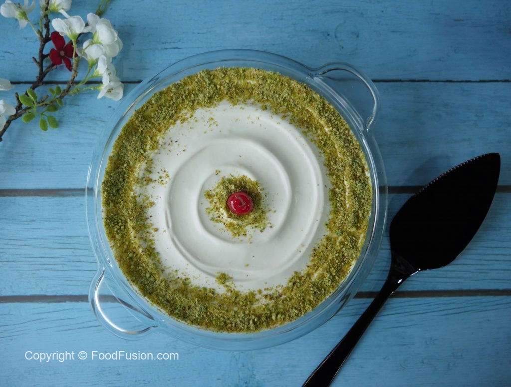 Serving dish mein tayyar cream ki layer dal ker evenly pheela lein.