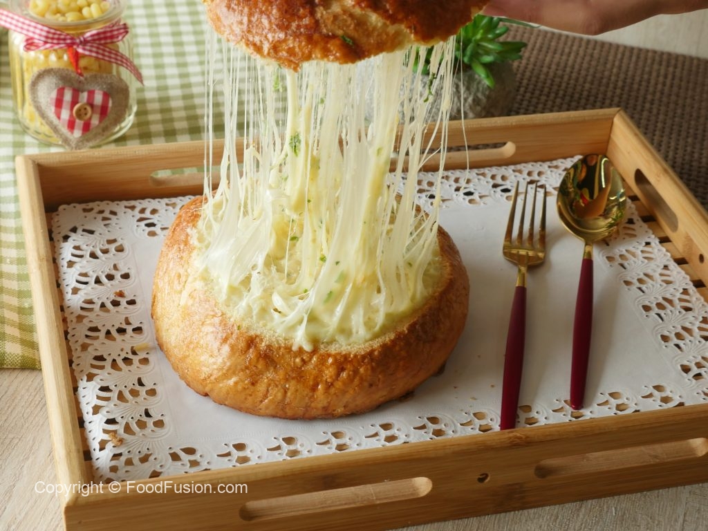 In bread bowl,add mac n cheese pasta,mozzarella cheese,parmesan cheese powder,fresh parsley and cover with top.