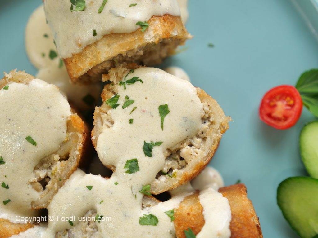 -Cut prepared malai chicken roll ups & drizzle prepared creamy sauce,sprinkle fresh coriander & serve (makes 4-5).