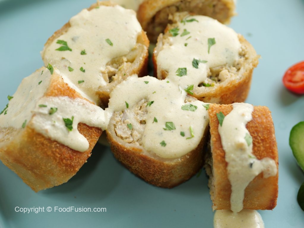 -Add & spread prepared filling on bread slice,onion & roll up.