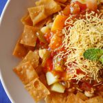 On serving plate,add boiled chickpeas,potato,green chili,prepared manchurian sauce,red chili crushed, chaat masala,papri and sev nimco.