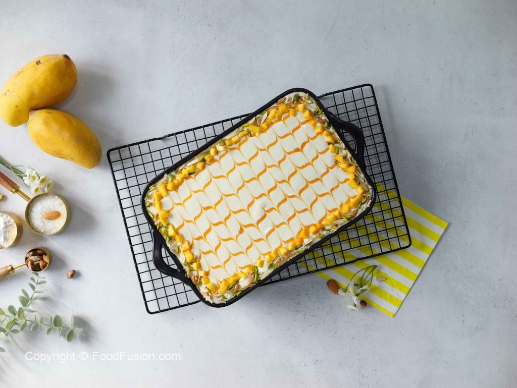 -Add & spread prepared cream mixture & garnish with prepared mango puree,almonds,pistachios & mango cubes.