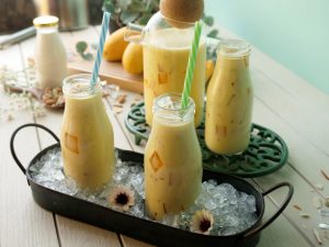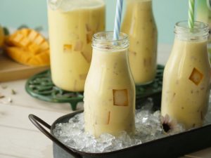 Serving bottle mein mango jelly cubes,tayyar doodh aur badam dal dein.