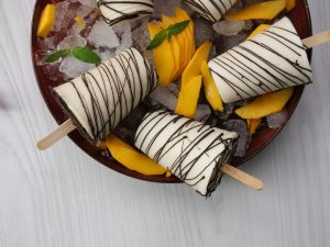 -Pour melted white chocolate in plastic disposable cups/Kulfi molds & tilt the cup to spread inside evenly then remove excess & let it set in refrigerator for 15 minutes then repeat chocolate coating,remove excess & refrigerate until set.