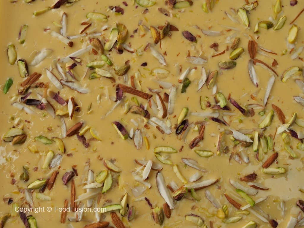 -Pour reserved mango malai milk & garnish with almonds,pistachios & serve!