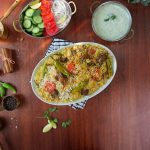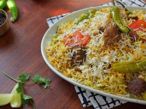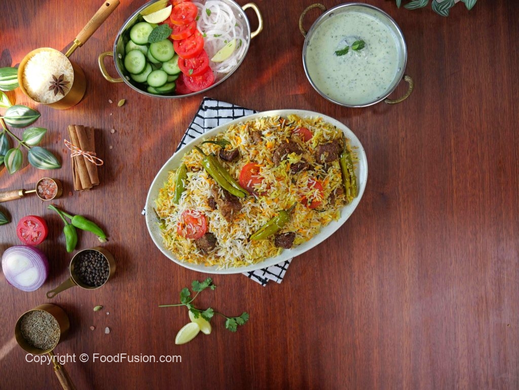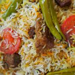 -Remove the cover of beef, mix well, add tomato slices, fresh coriander, mint leaves, half of boiled rice, prepared dahi mirch, half of leftover boiled rice, tomato slices, saffron essence, orange food color, & clarified butter.