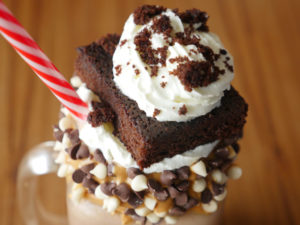Decorate glass with peanut butter,white and black chocolate chips,pour brownie & peanut butter shake,add chocolate ice-cream,whip cream,brownie and garnish with whip cream.