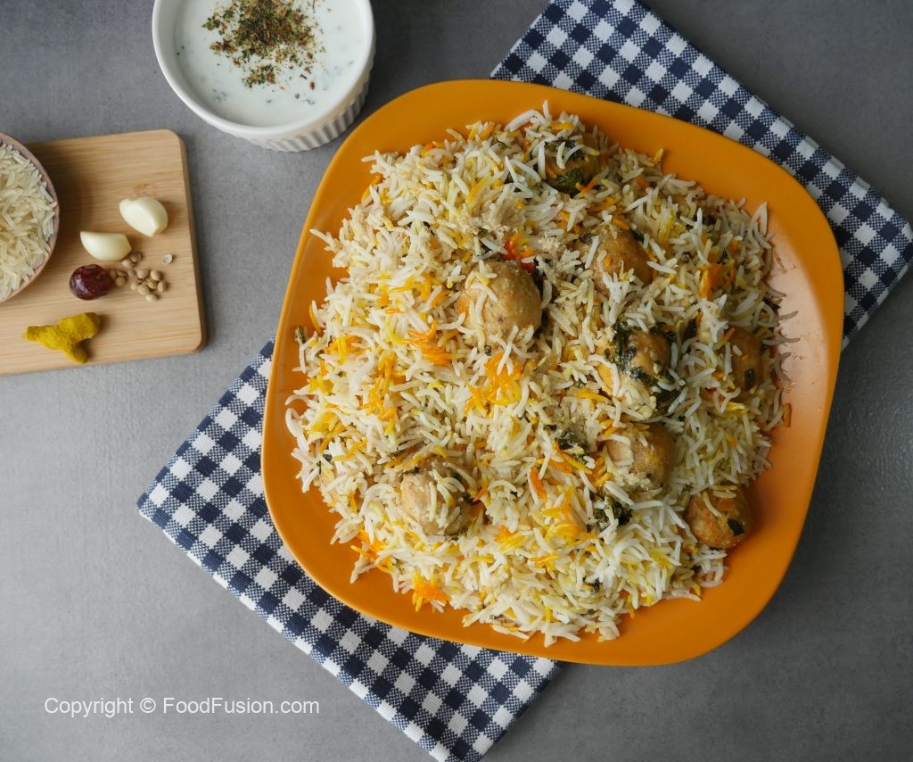 In pot,add half quantity of boiled rice,meat balls with gravy,mint leaves,fresh coriander and remaining quantity of boiled rice.