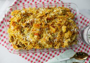 Add boiled rice,fried onion,cover and steam cook on low flame for 8-10 minutes & serve!