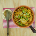 In pan heat oil, add onion and fenugreek seeds fry till light gold. Add tomatoes and when tender add GGP, chicken and red lentils and mix well. Add crushed chilies, coriander powder, turmeric, cumin powder, red chili powder and black pepper. Mix well, add water and salt and cover the lid till chicken is about to done.