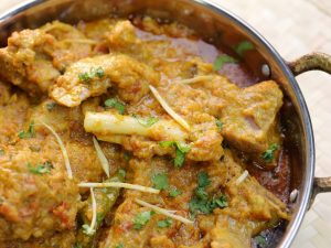 -Scum ko remove ker lein,pink salt,adrak lehsan paste, aur hari mirchein dal ker ache tarhan mix karein aur dhak ker halki ancch per 90% done ho janay tak paka lein (30-35 minutes) (1 & ½ Cup water should remain).