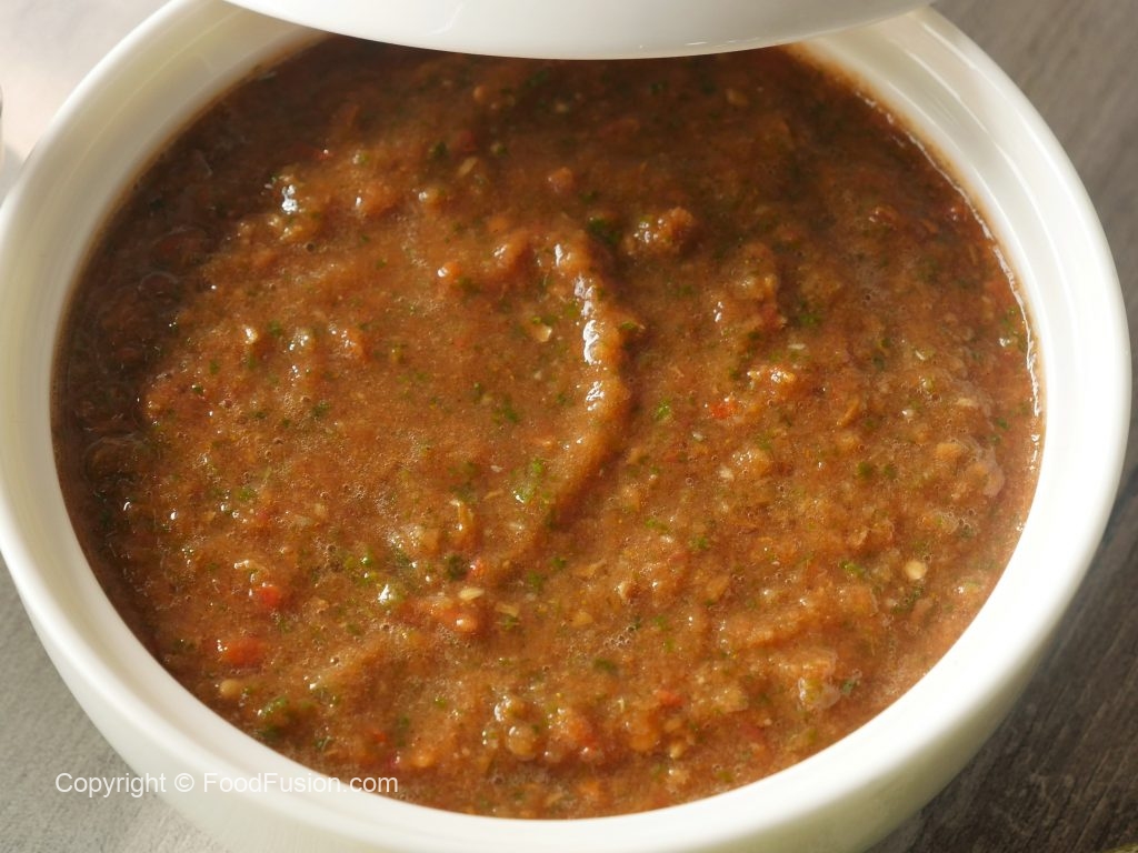 Blender jar mein hari mirch,lehsan,sabut dhania,namak,curry powder,hara dhania,lemon juice,tamatar aur pani dal ker ache tarhan blend ker lein.