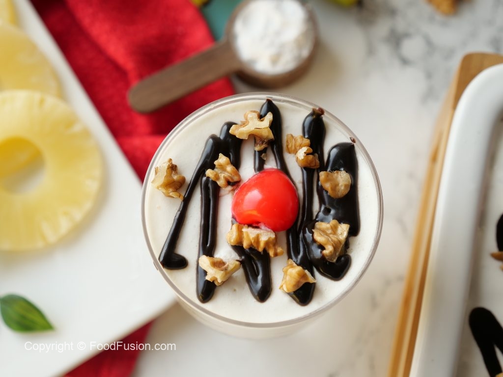 Add banana slices,pineapple chunks,olper’s whipped cream layer & refrigerate until chilled (2-3 hours).