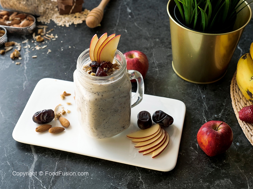 Glass mein instant oats,chai seeds,dahi,khajoor,mixed nuts,saib,darchini powder aur doodh dal ker ache tarhan mix karein aur dhak ker 6 hours ya overnight kliya refrigerator mein rakh dein.