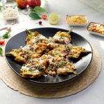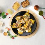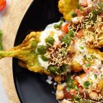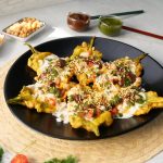-Assemble fried palak patta on a platter,add chickpeas,bareek boondi,tomato,onion,yogurt,khatti meethi chutney,green chutney,sprinkle chaat masala,nimco sev & fresh coriander & serve!