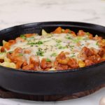Cast iron pan mein penne pasta,cooked chicken,mozzarella cheese,hara pyaz aur black & white til ker dhak dein aur halki ancch per cheese melt ho janay tak paka lein (4-5 minutes).