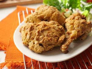 Crispy air fried chicken ko sauce & salad ka sath serve karen.