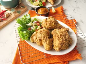 Serve crispy air fried chicken with sauce & salad.
