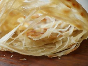 Ek part lein aur ball bana ker maida chirak dein aur rolling pin ki madad sa thin bail lein.