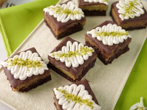 -Cut into pieces & decorate with white chocolate ganache,pistachios & serve!