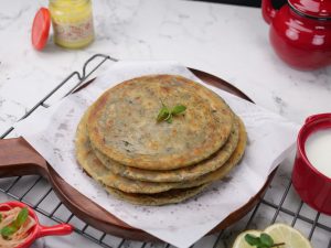 On heated griddle,place paratha,add ghee & fry paratha from both sides until done (makes 6).