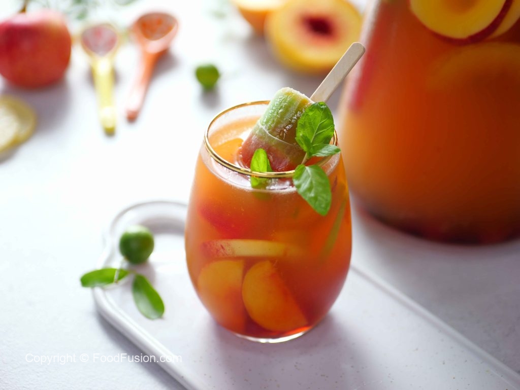 -In a jug,add ice cubes,prepared lemonade,peach,red grapes,apple,lemon,orange juice,pineapple juice, sparkling water,omore traffic light & mix well.
